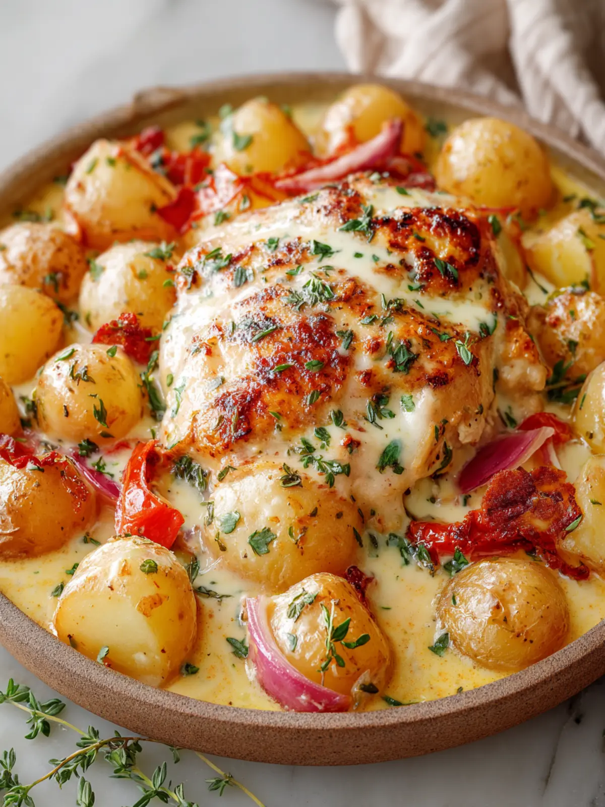 This creamy chicken and potato bake is a comforting and hearty dish, perfect for family dinners.