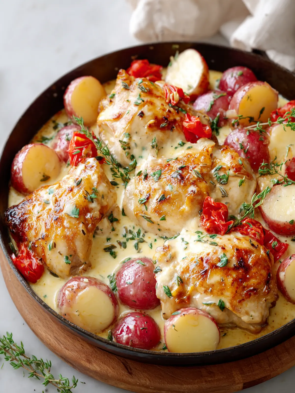 Opt for bone-in, skin-on chicken thighs for the best flavor and moisture retention. They’re less prone to drying out compared to chicken breasts and become irresistibly tender when cooked in the creamy sauce.