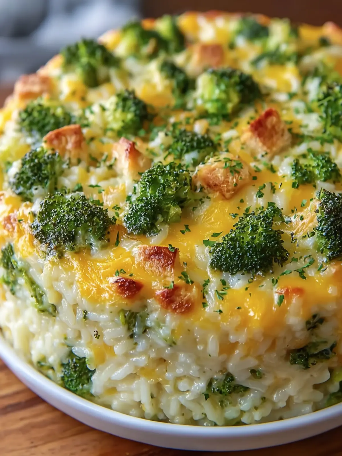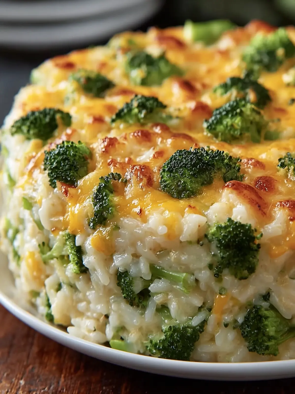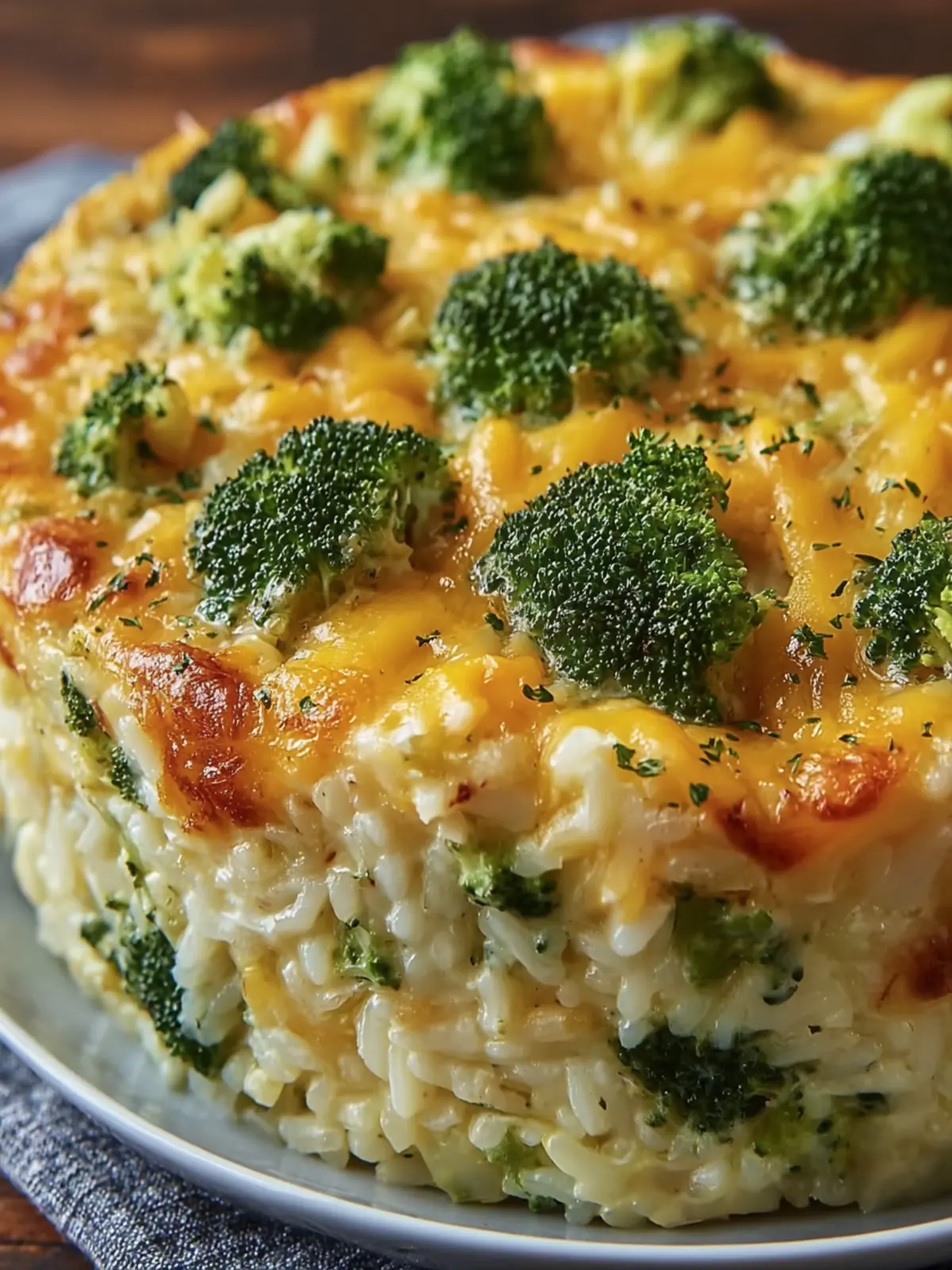 A comforting and cheesy casserole loaded with broccoli, rice, and cheddar cheese.