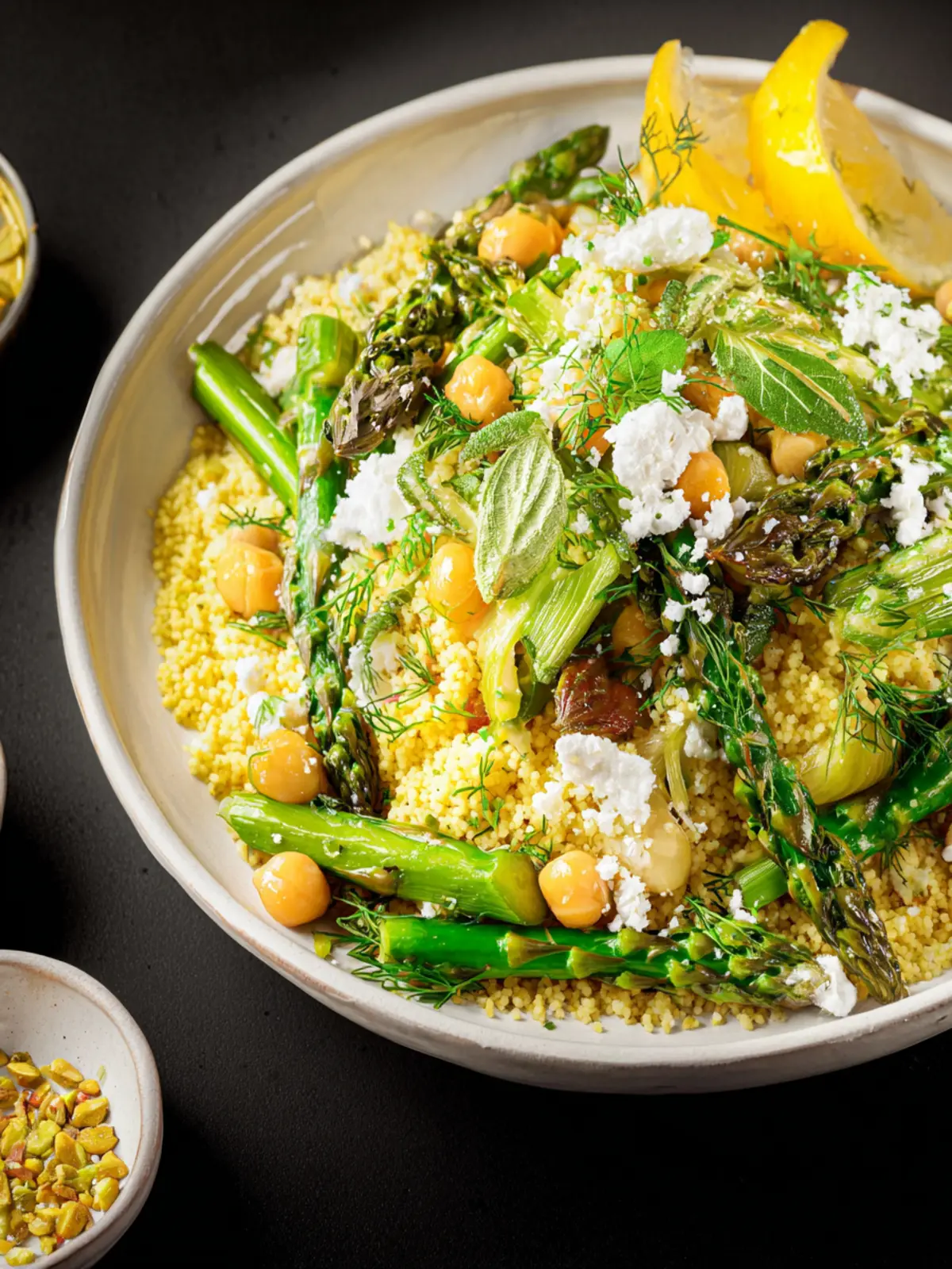 - To a bowl, add the cooked couscous, asparagus, chickpeas, dill, parsley, vegan feta, and pistachios. Drizzle on the lemon dressing and toss. Enjoy immediately, or store in the fridge for up to 3 days.