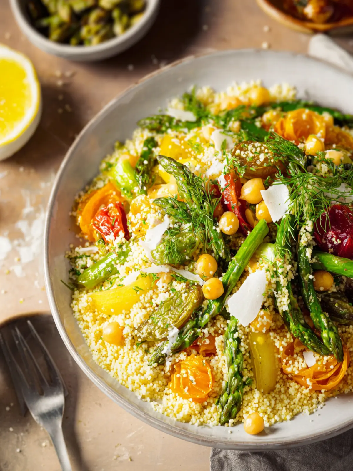 Couscous, a star ingredient in this dish, is quick to prepare and wonderfully adaptable, serving as a perfect base for a variety of tastes. Its texture is light and fluffy, creating an inviting contrast with the crispiness of asparagus—a vegetable celebrated for its health benefits and seasonal availability. Add to that a dash of lemon juice for brightness, some herbs for freshness, and you’ve got a salad that’s not only good for your body but delightful for your palate.