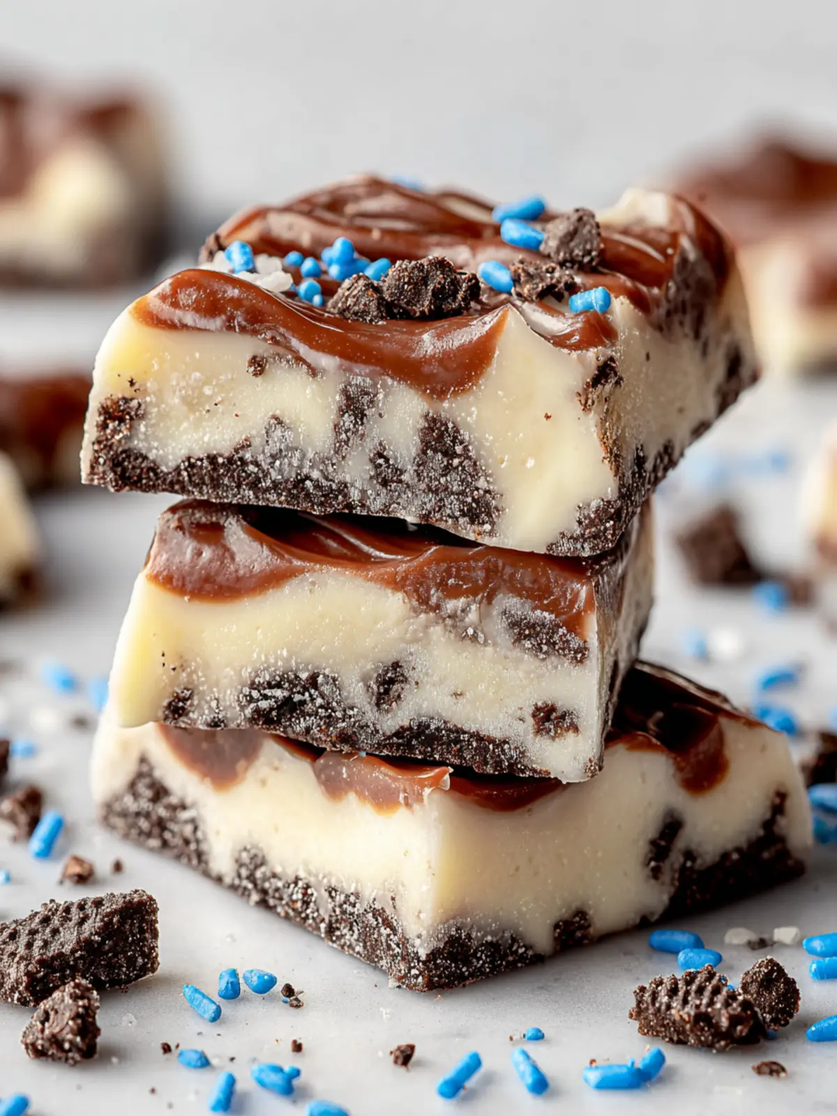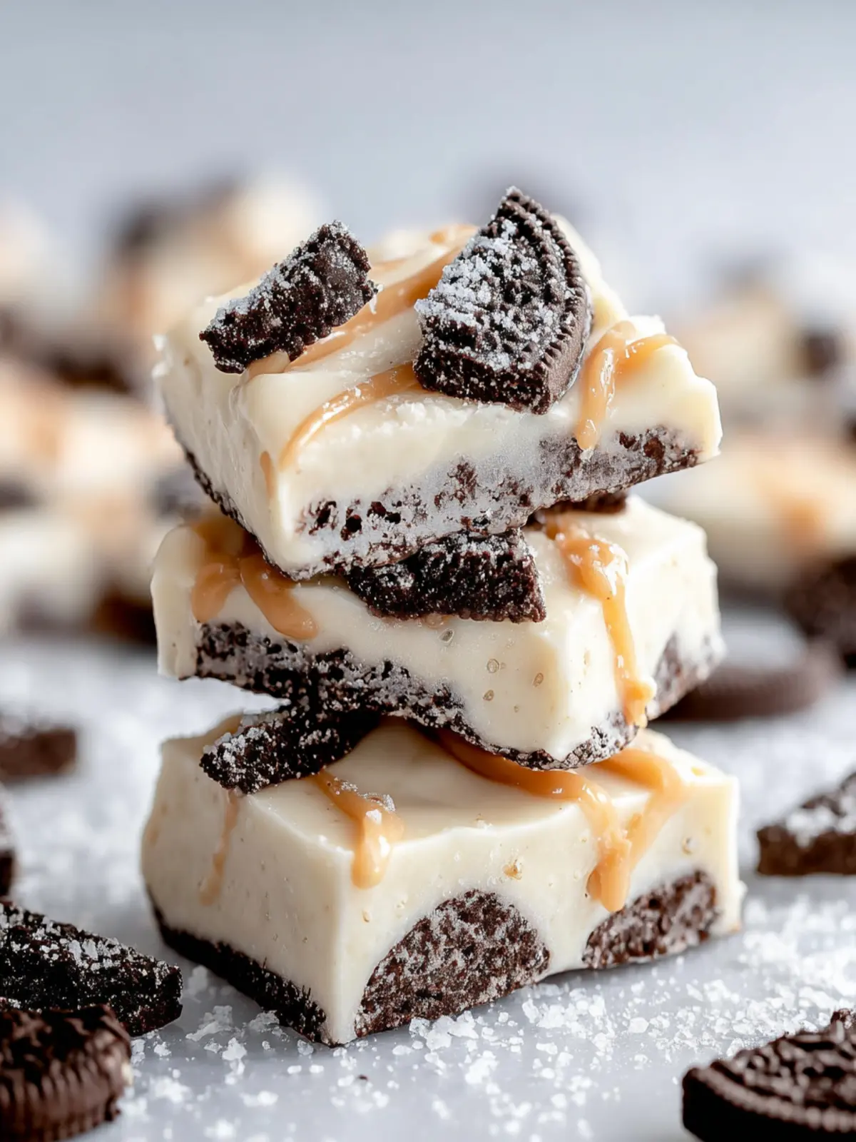 A delicious treat made with white chocolate, caramel, and Oreo cookies.