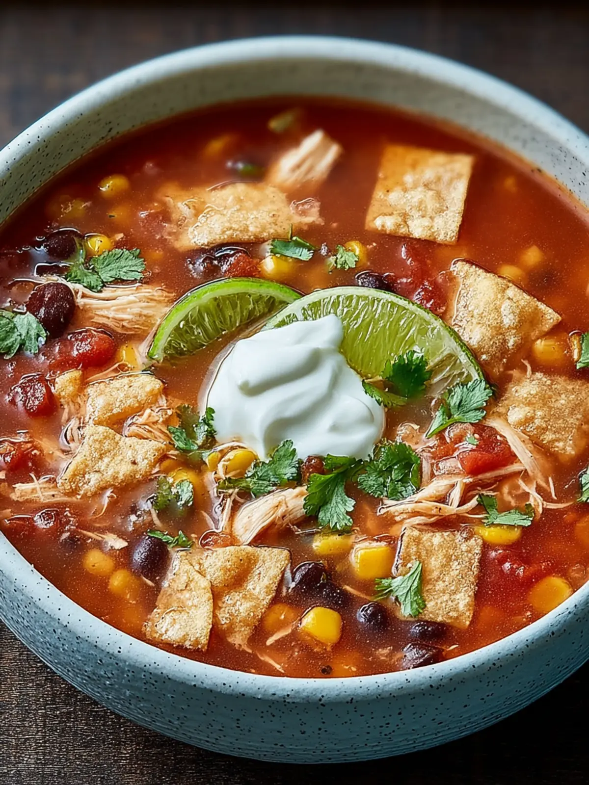 A hearty chicken tortilla soup made with canned chicken, tomatoes, corn, and black beans.