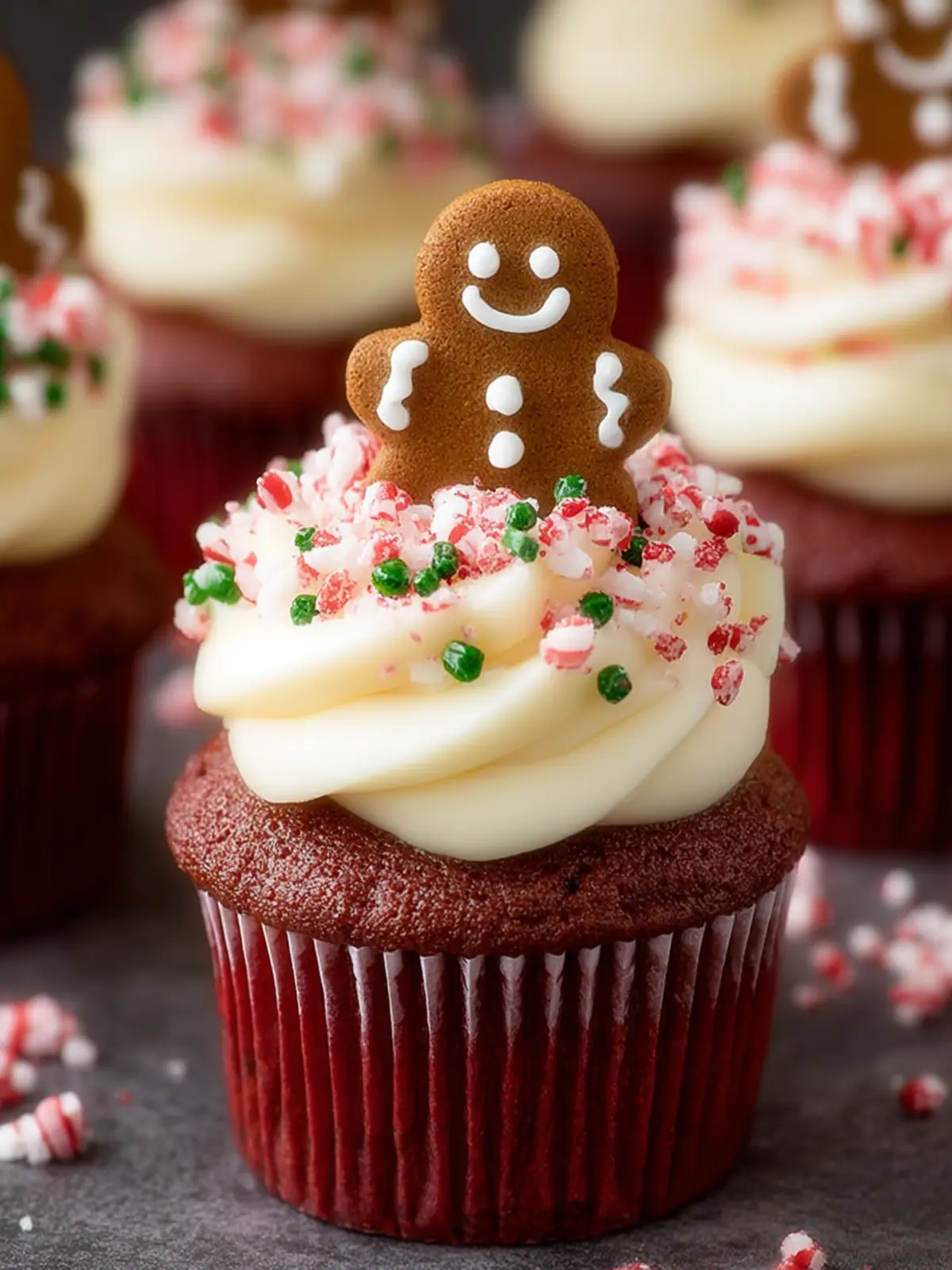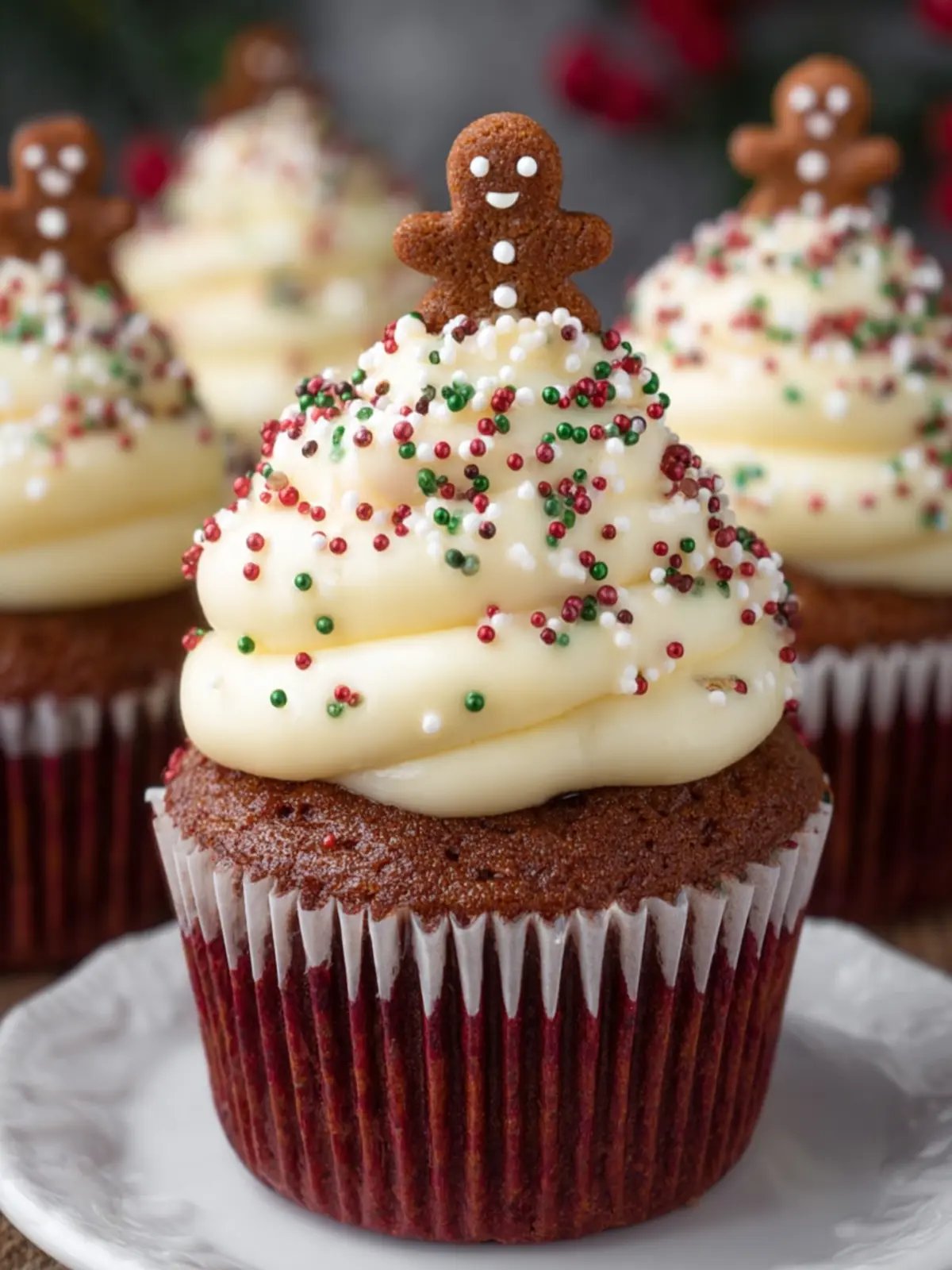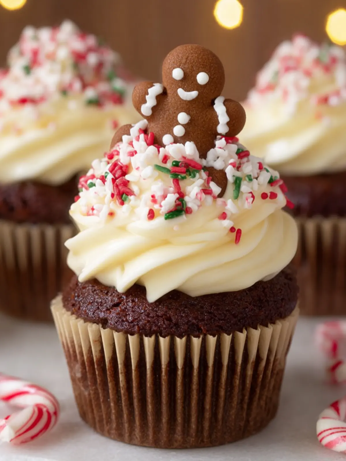 - Decorate: Once the cupcakes are completely cooled, pipe or spread the frosting onto each cupcake. Decorate with festive sprinkles and top each cupcake with a mini gingerbread cookie.