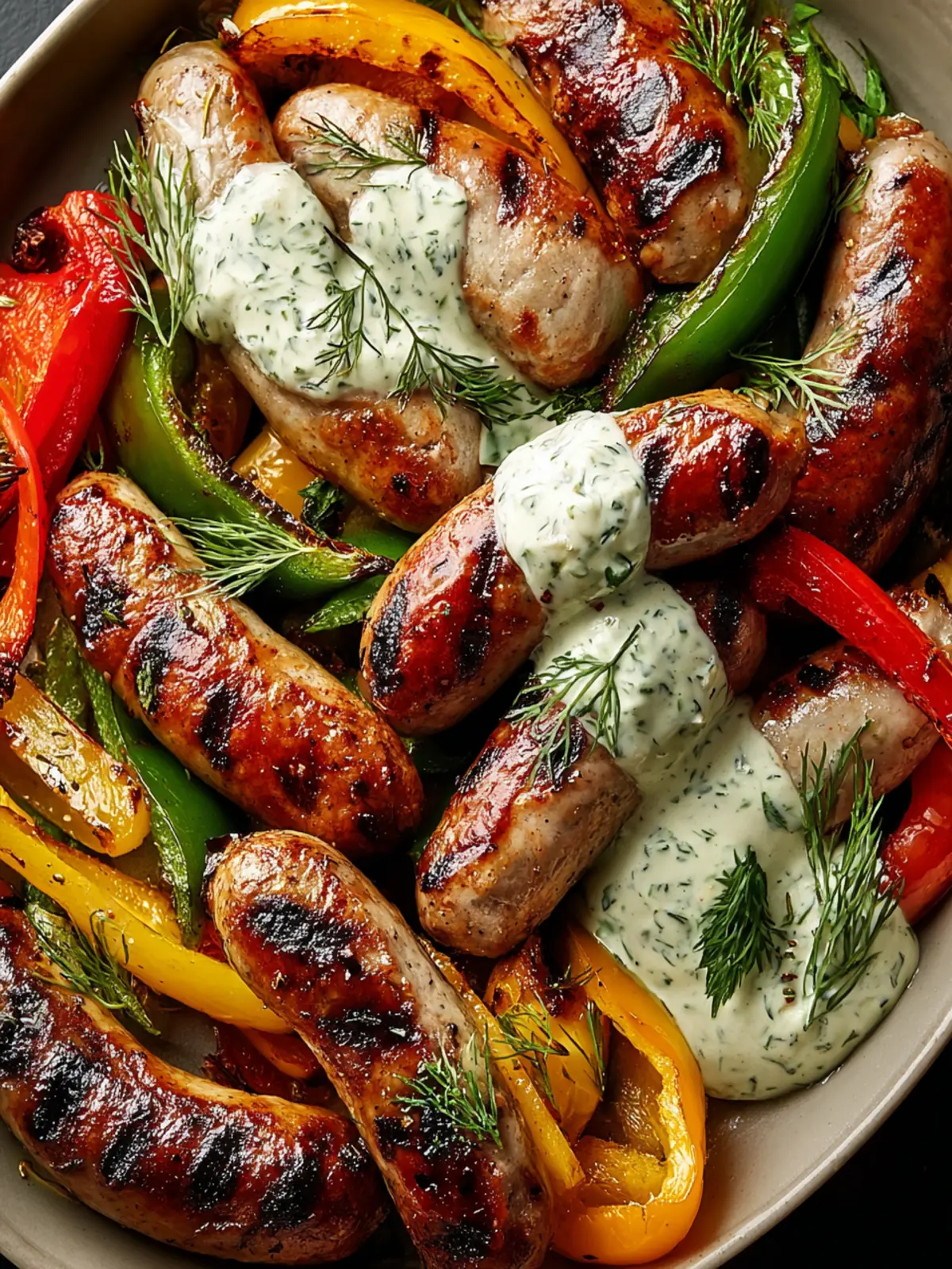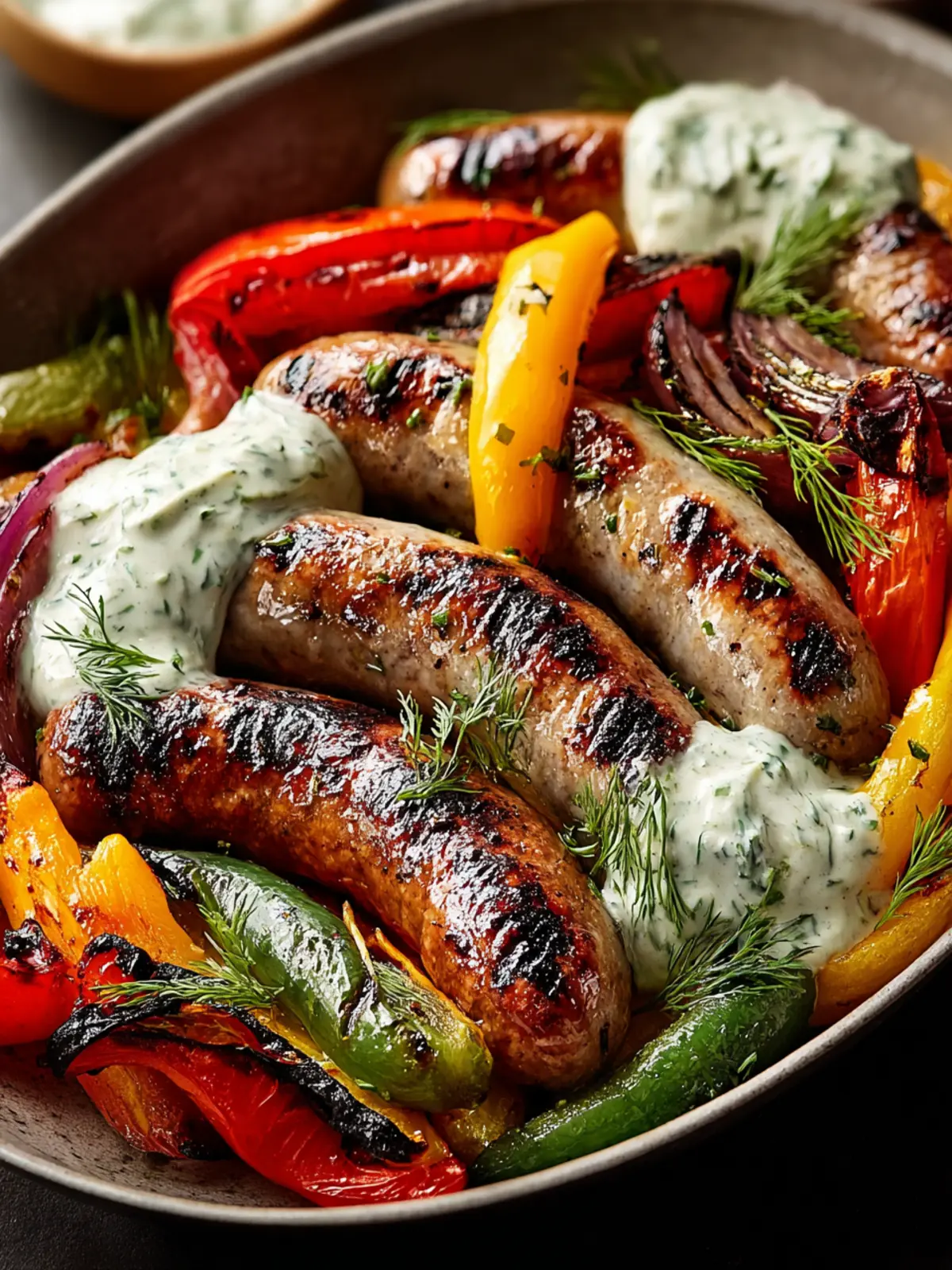 The magic lies not only in the grilling method, but also in the selection of ingredients. The crispy, caramelized edges of the sausage and the smokiness of the veggies complement each other beautifully. Plus, the creamy dill dip takes everything to the next level, adding a cool and herby contrast to the dish that uplifts each bite.