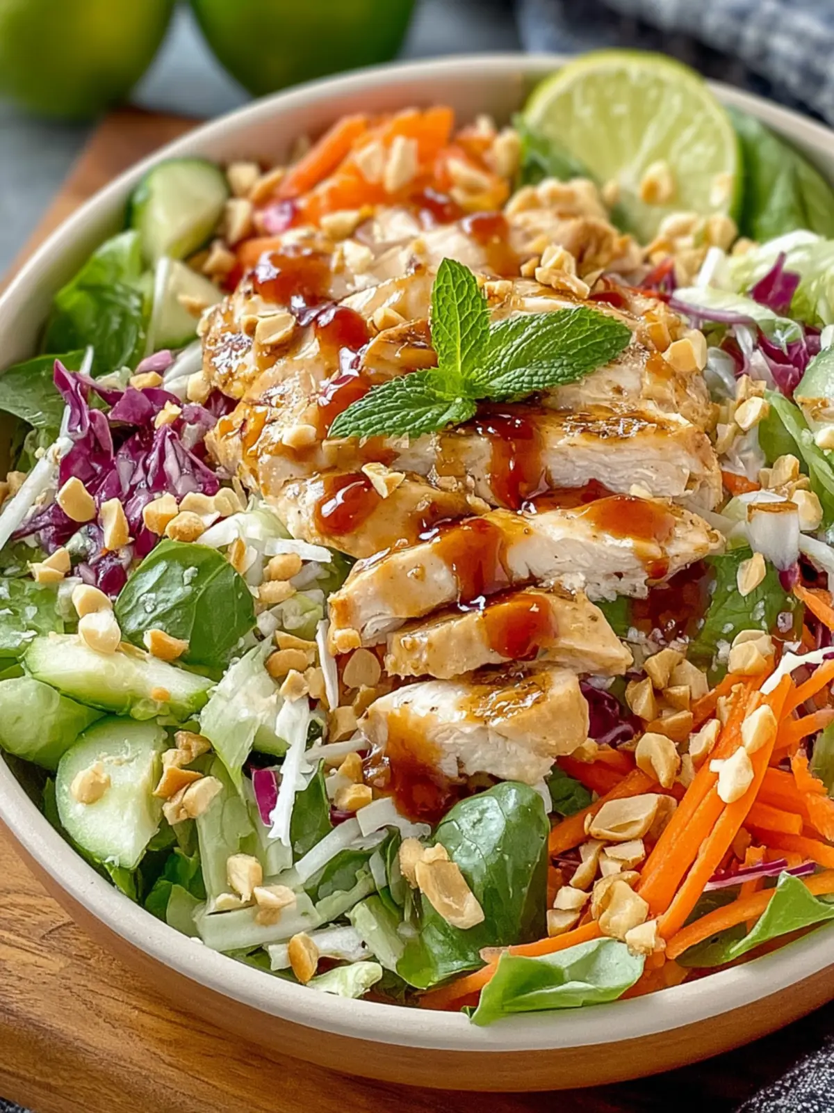 This refreshing chicken salad combines tender shredded chicken, crisp vegetables, and a savory dressing topped with roasted peanuts.