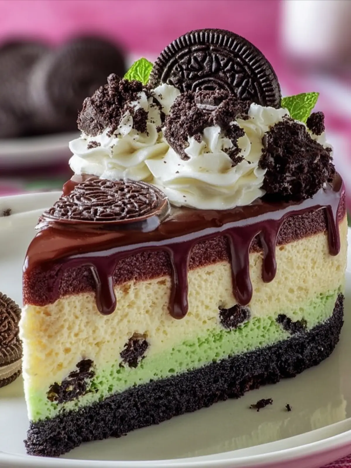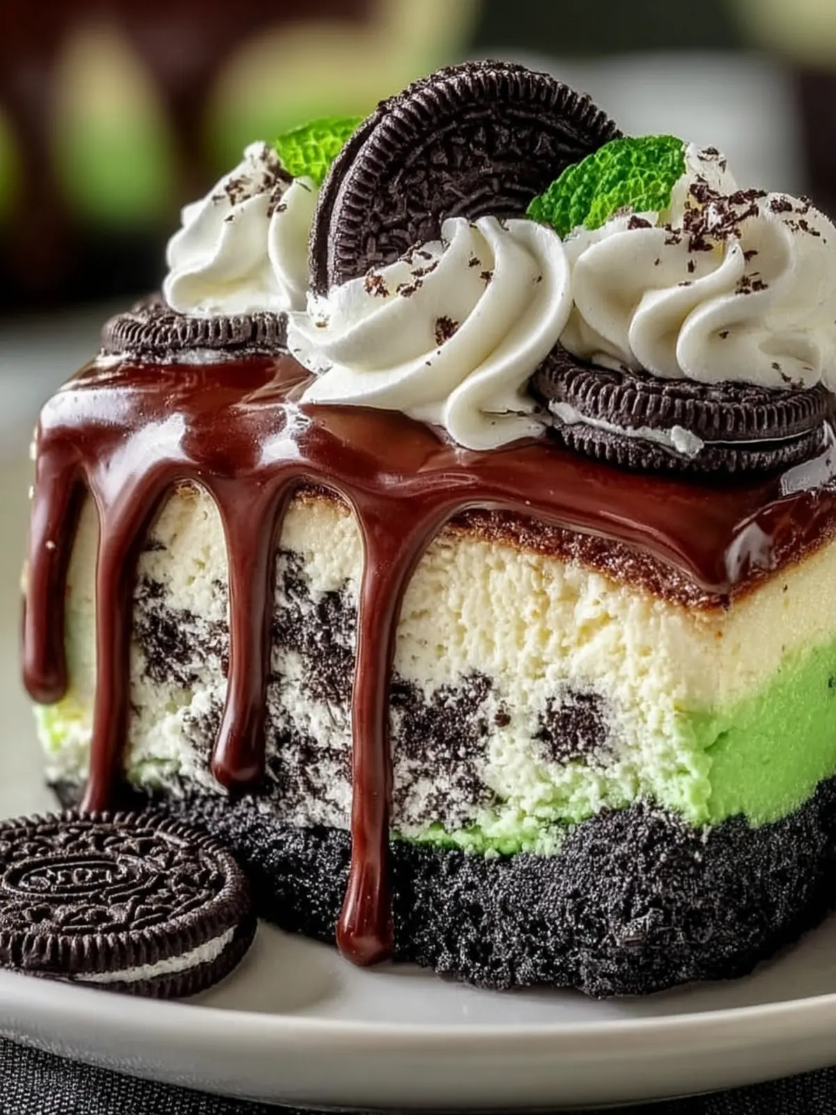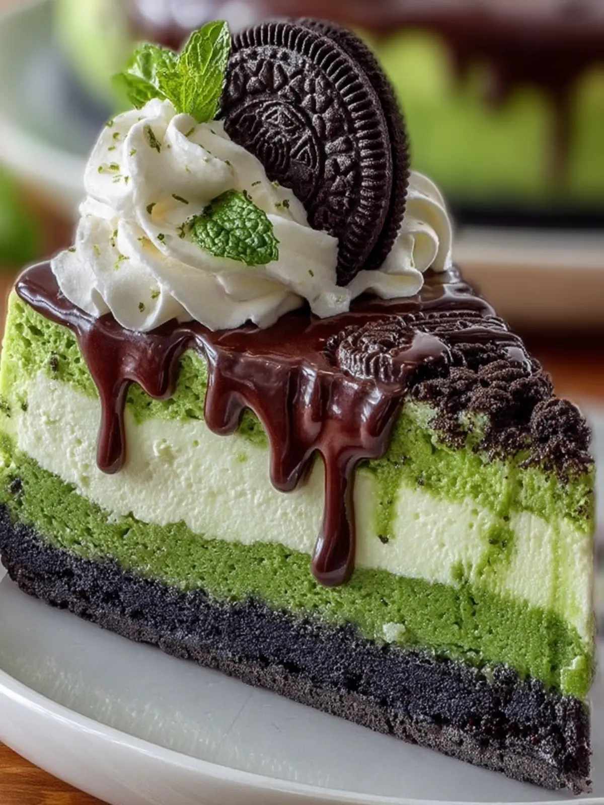 A rich and creamy mint chocolate cheesecake with an Oreo crust, perfect for any occasion!