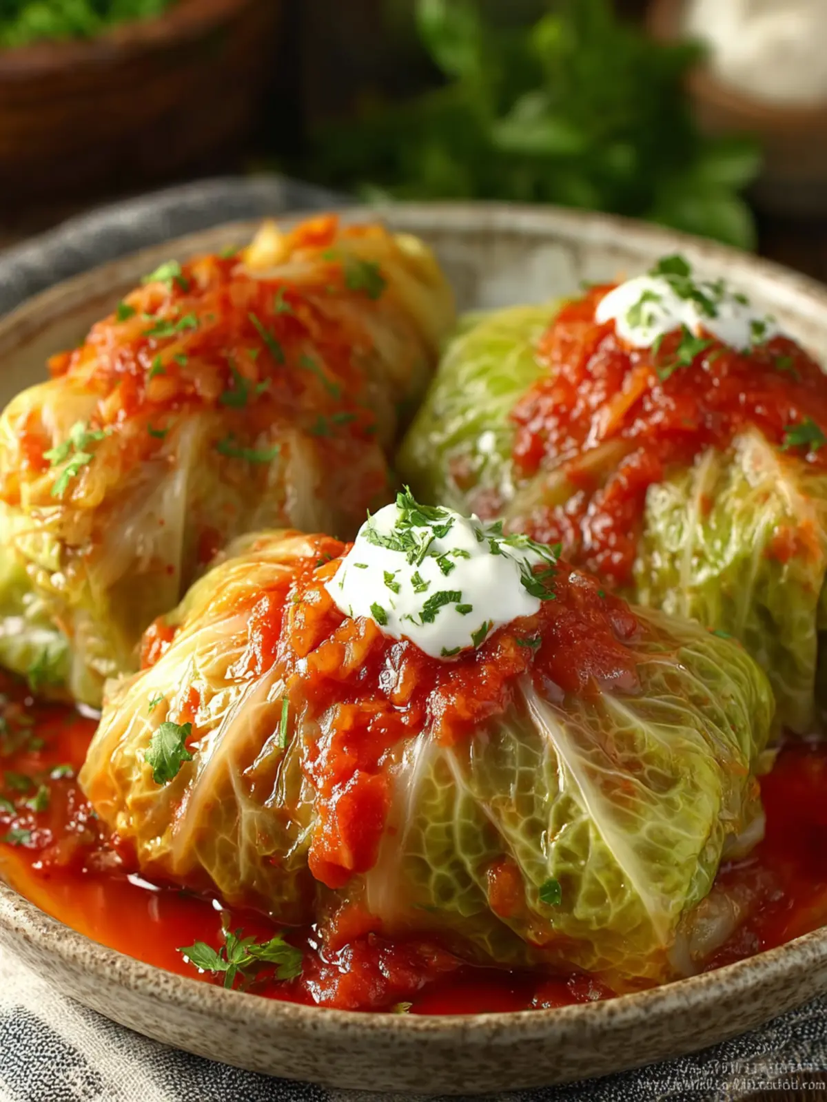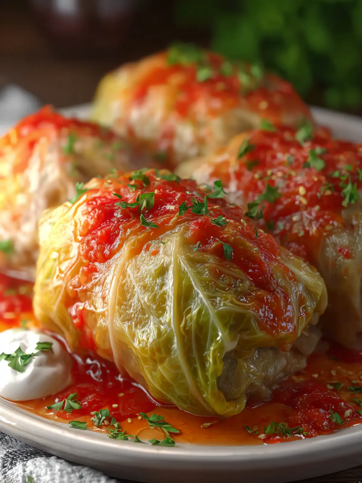 Delicious stuffed cabbage rolls filled with ground beef, rice, and spices, topped with tomato sauce.