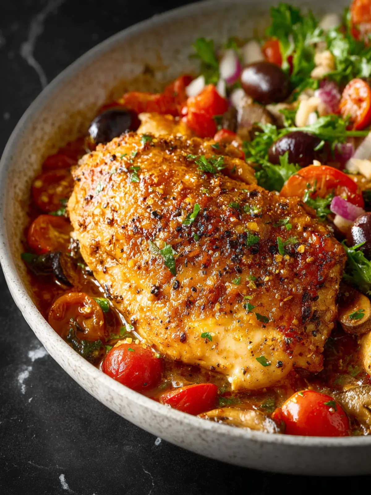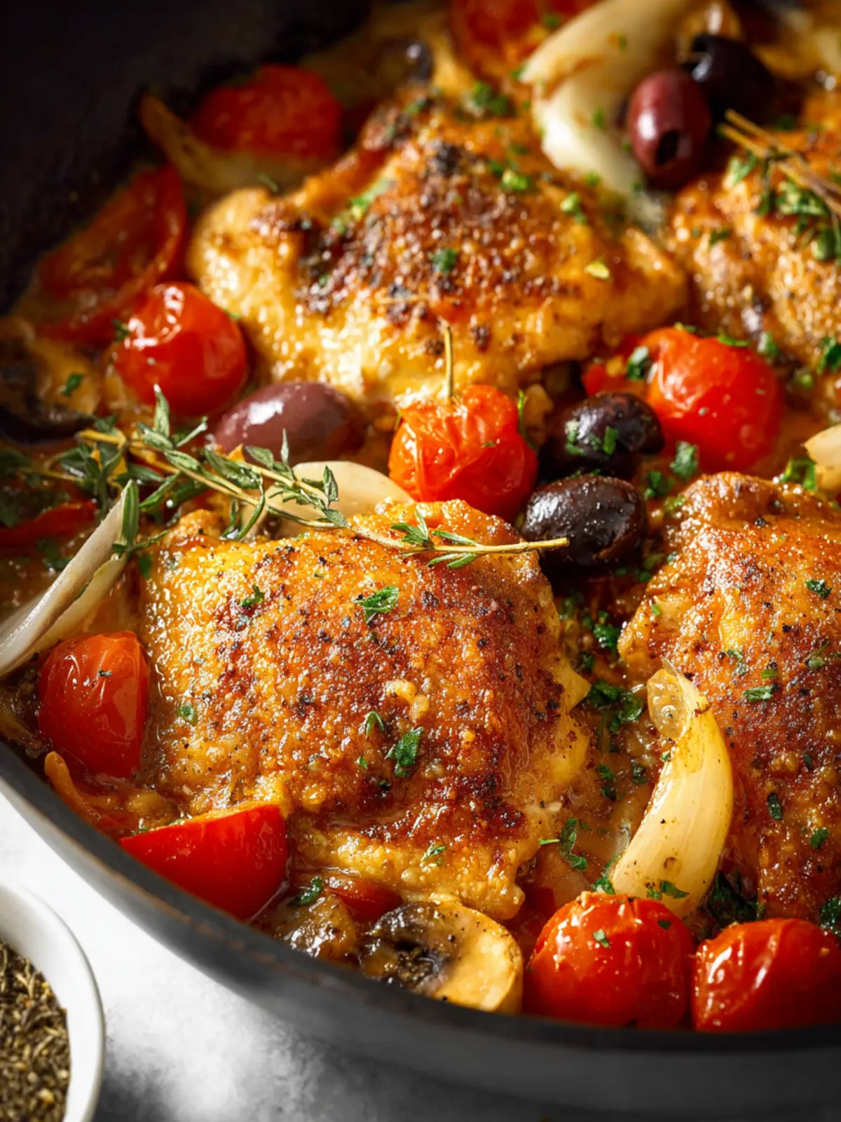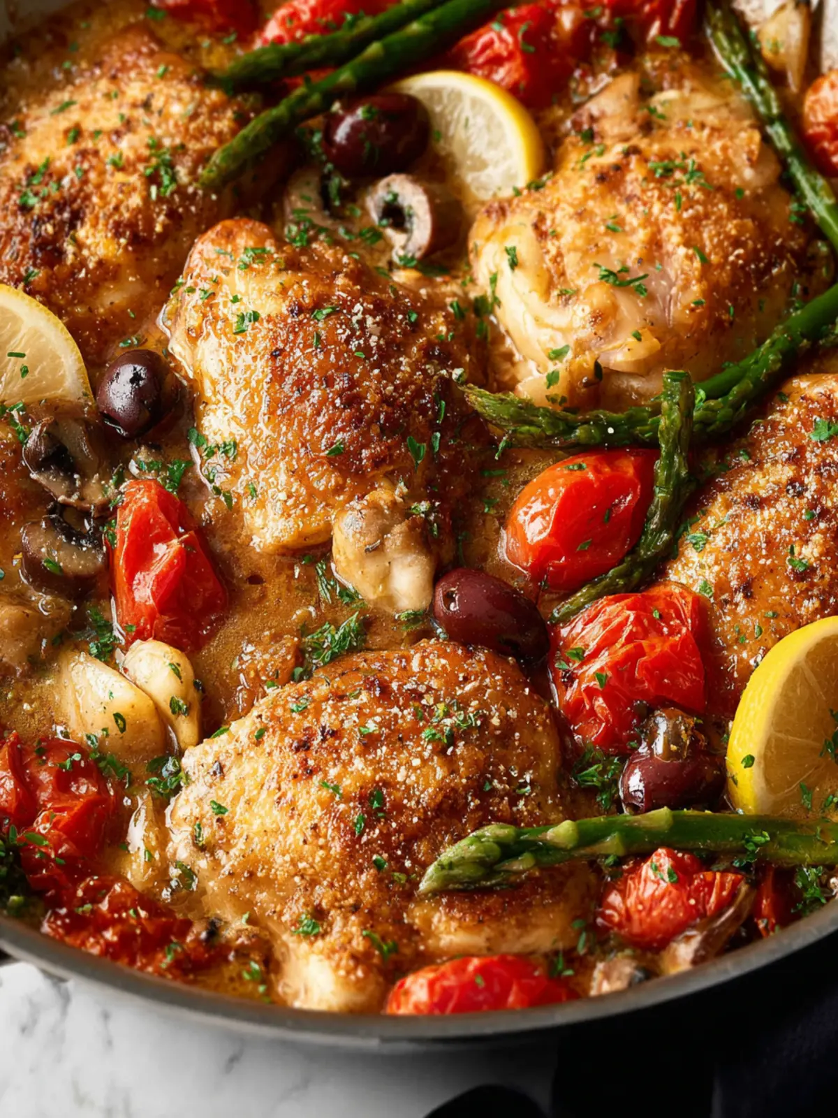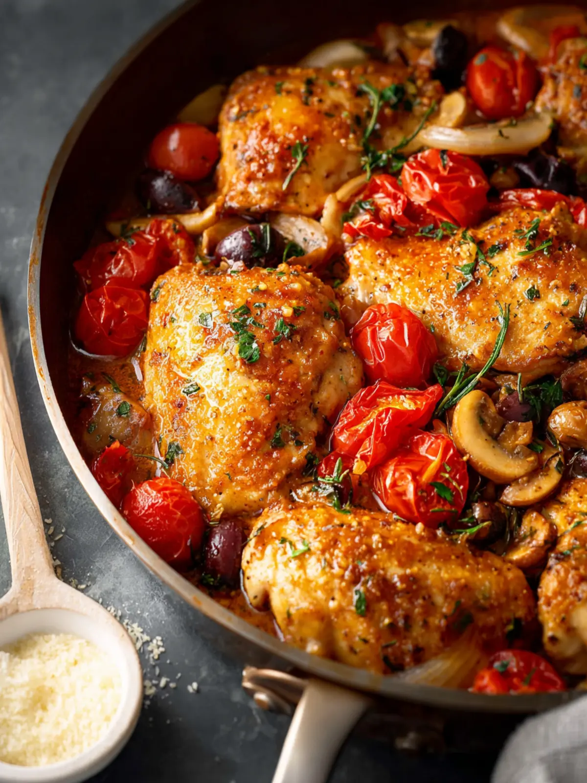 A delicious chicken dish featuring tender chicken breasts or thighs, sautéed mushrooms, and flavorful olives, finished with a touch of creaminess from butter and parmesan.