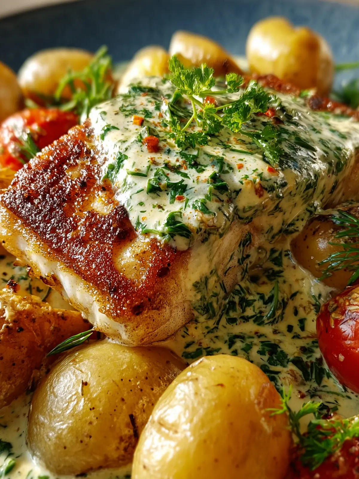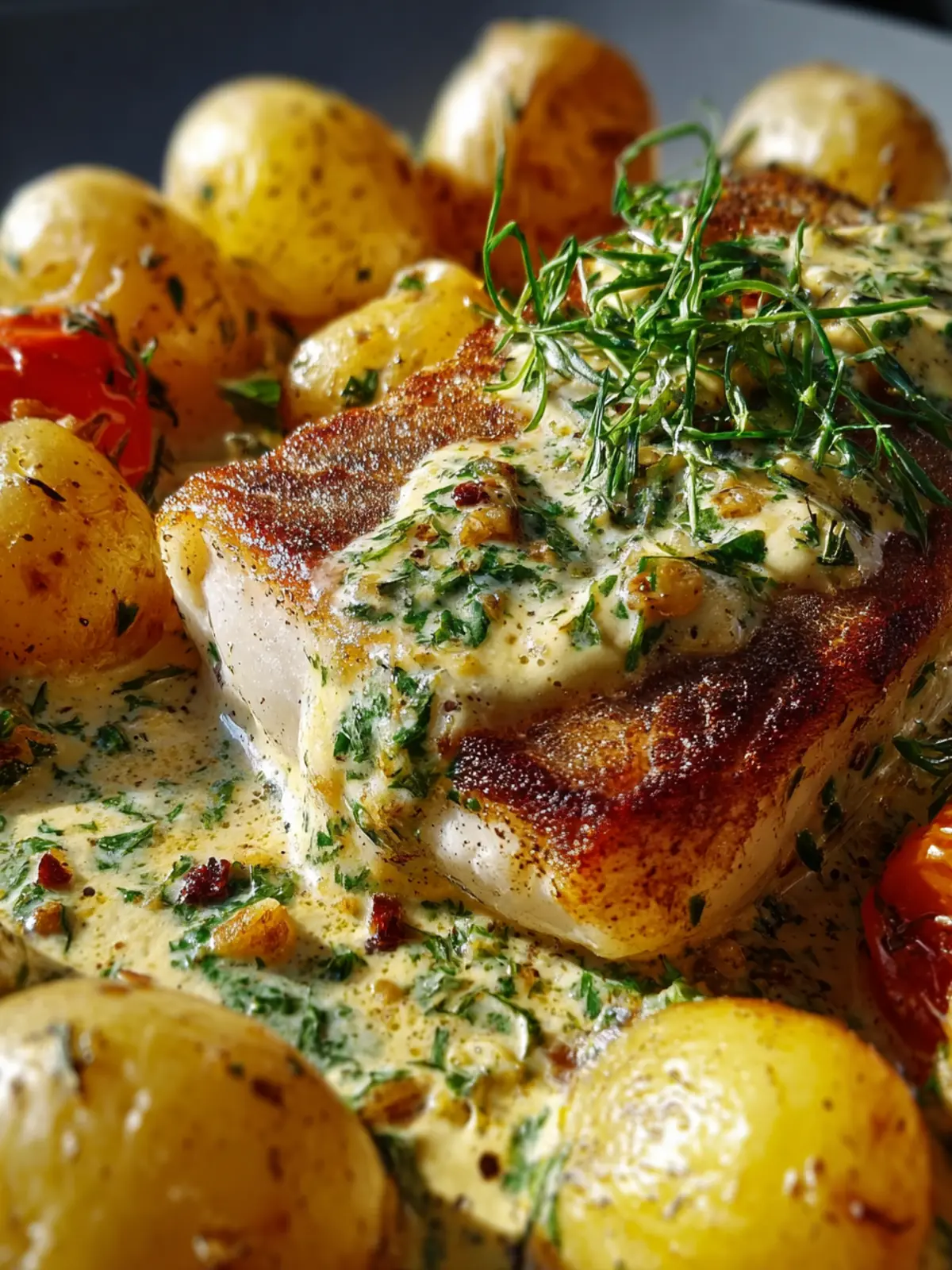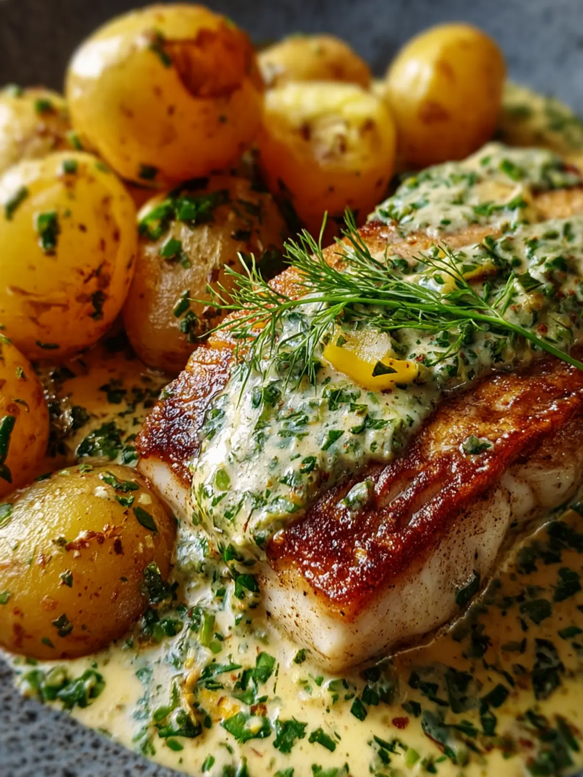 Pan-Seared Fish: Indulge in Herb Cream Sauce & Baby Potatoes