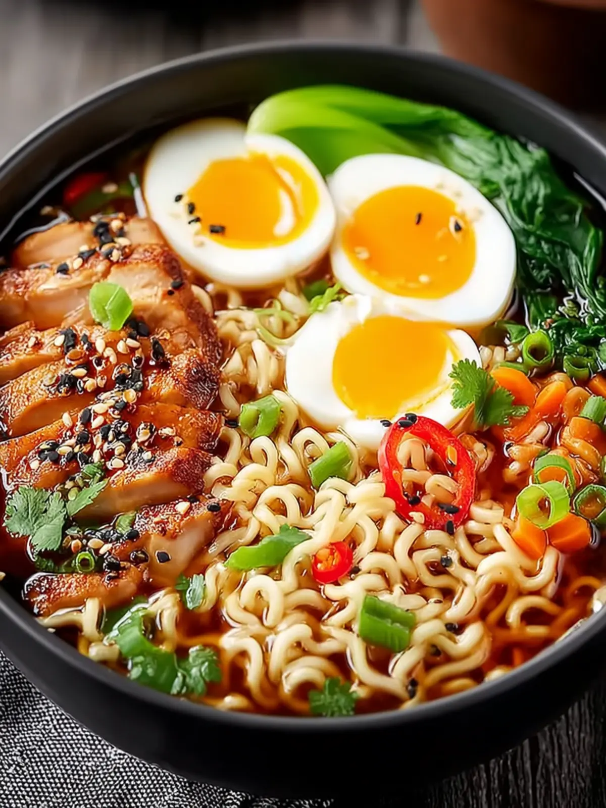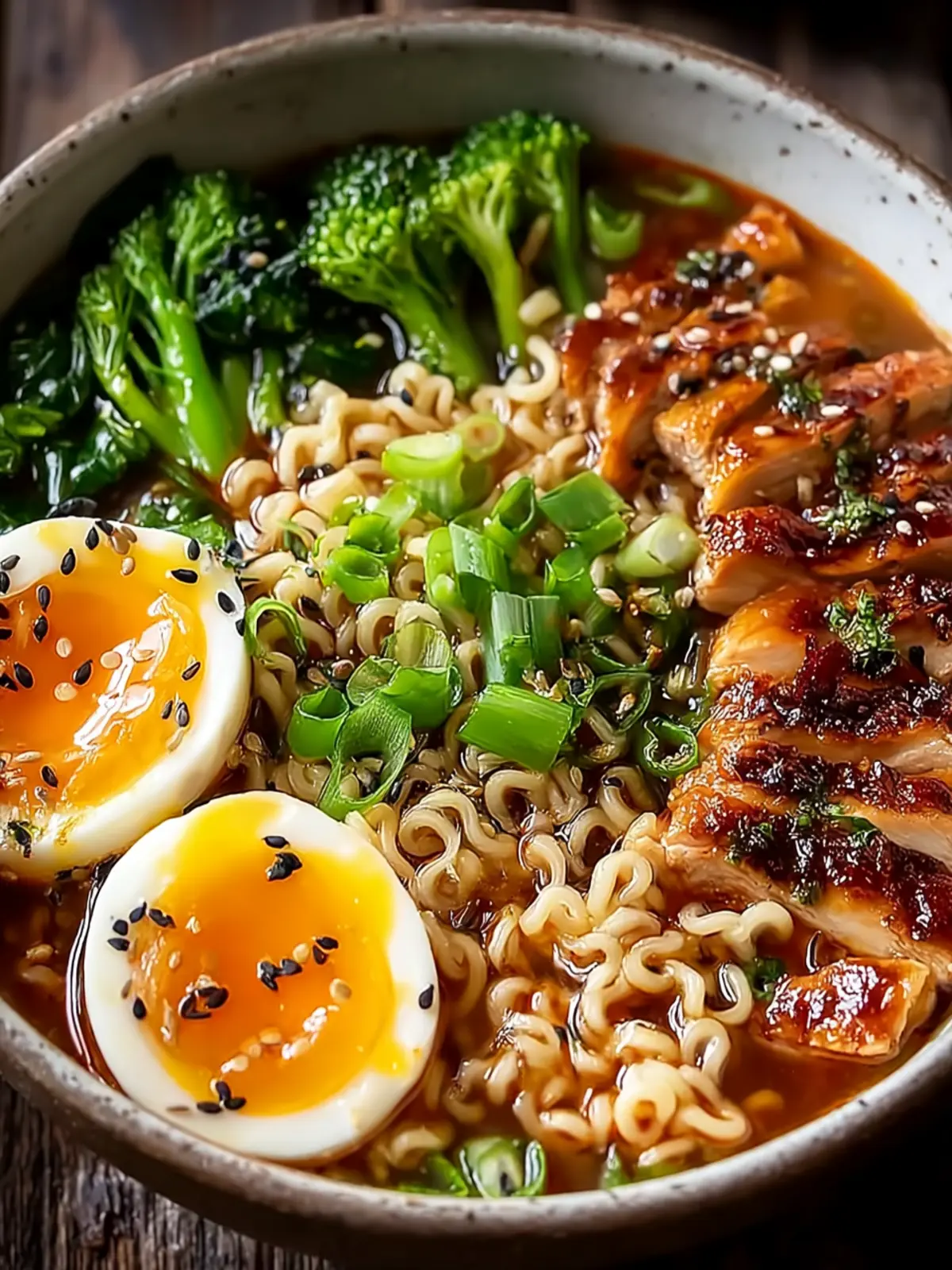 A comforting bowl of homemade chicken ramen with tender chicken, flavorful broth, and delicious toppings.