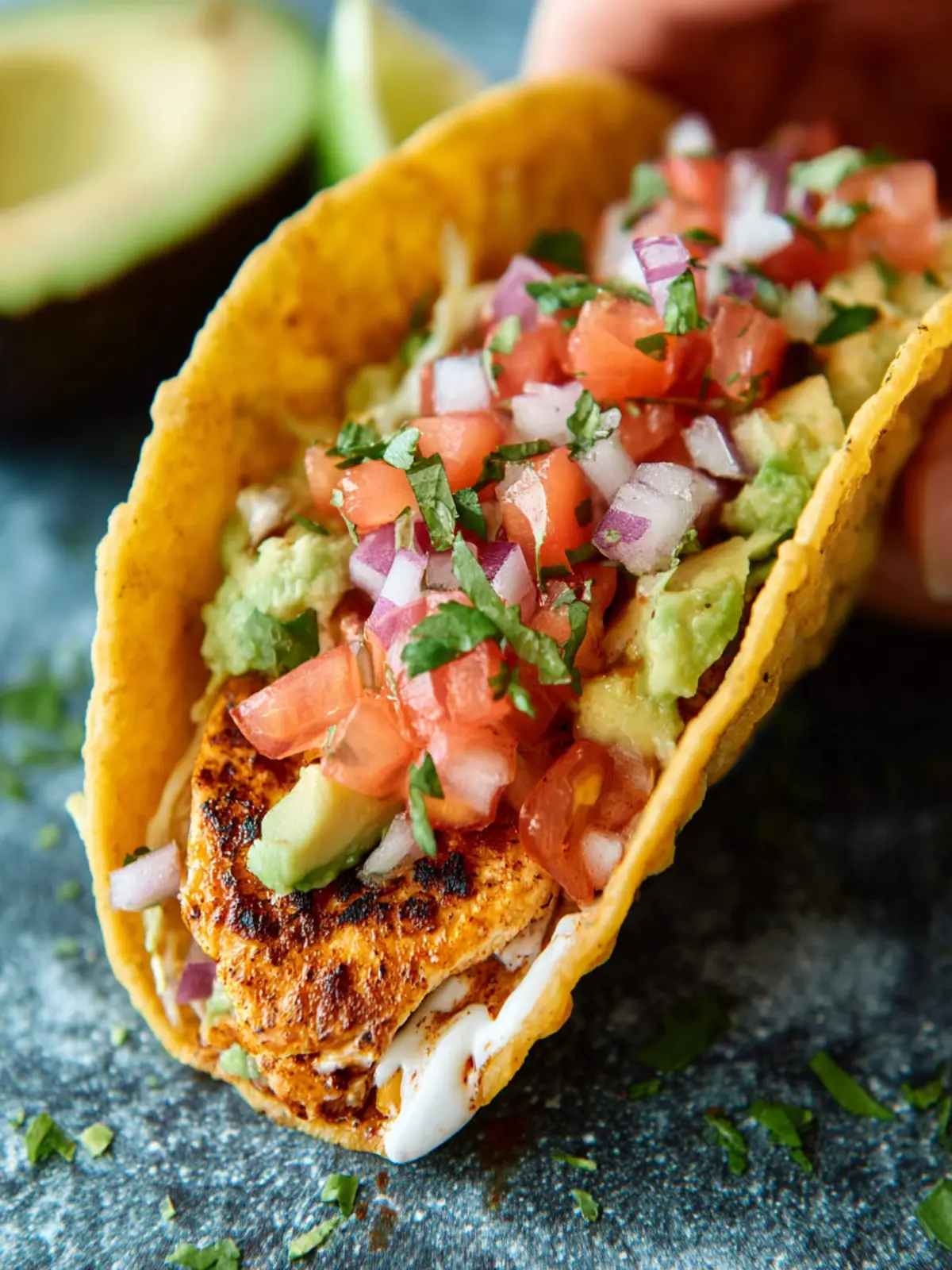 Delicious turkey tacos served in crispy tortillas with avocado and pico de gallo.