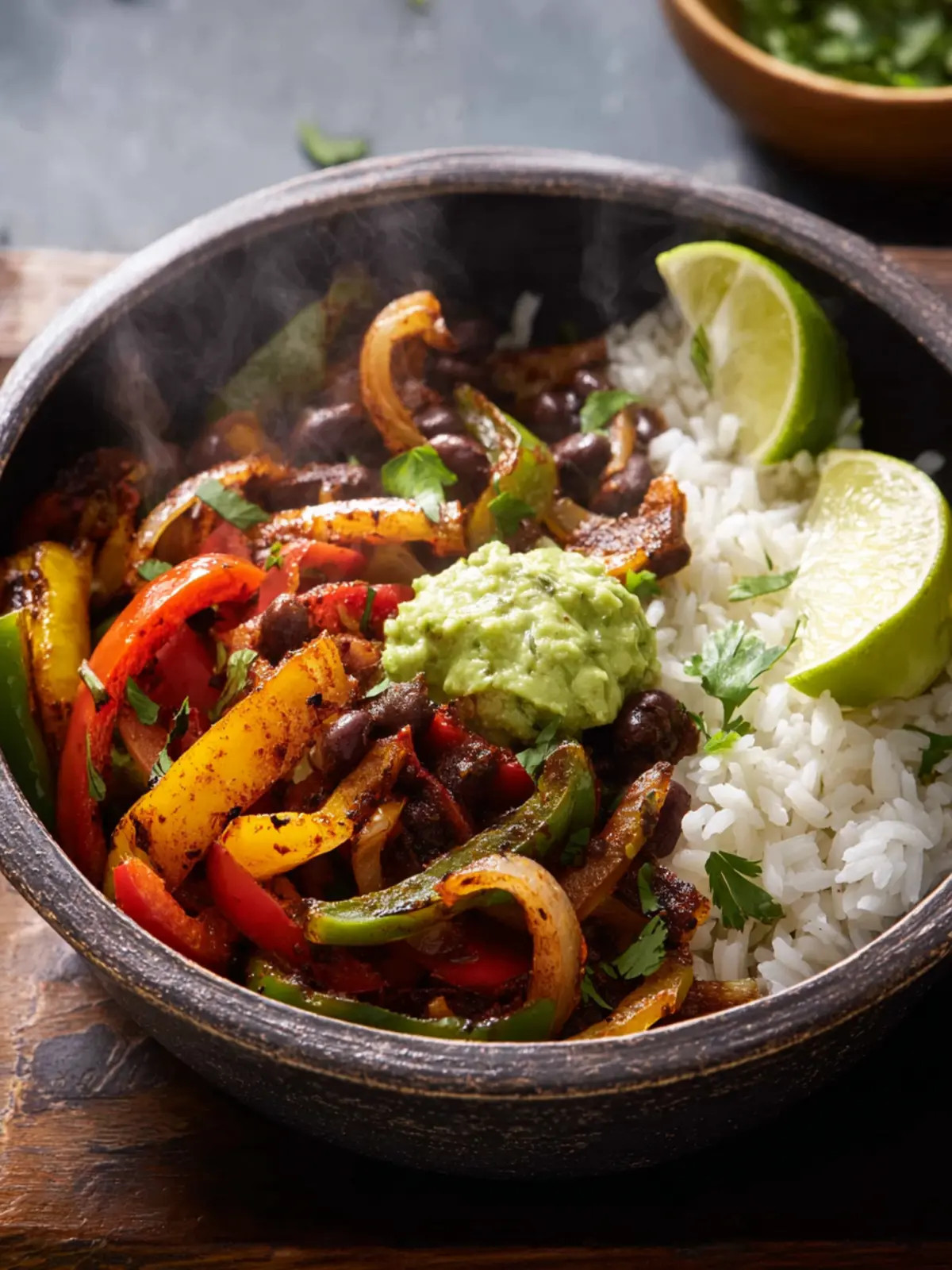 A delicious fajita rice bowl topped with creamy avocado and fresh cilantro, perfect for a quick and healthy meal.
